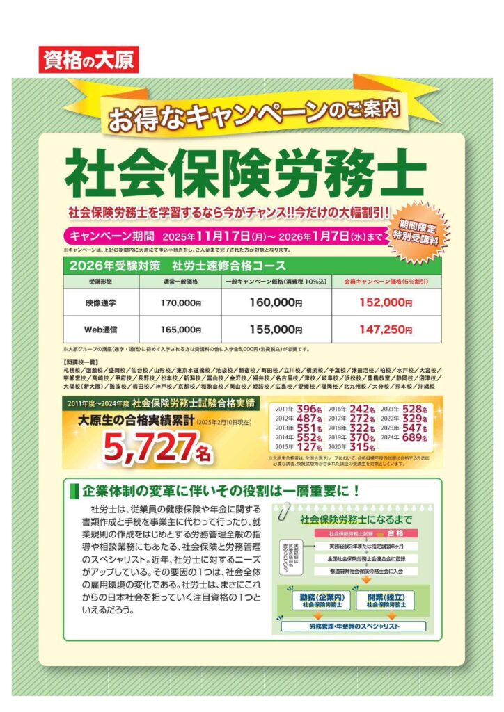 11/17(月)~1/7(水)まで【資格の大原】社会保険労務士キャンペーン(速修合格コース)